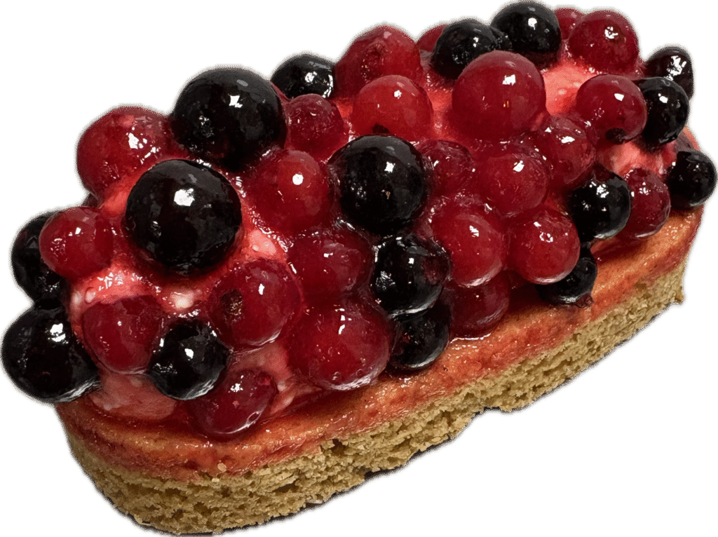 Ons bosvruchten gebakje heeft een heerlijke koelbodem afgewerkt met slagroom en bosvruchten.